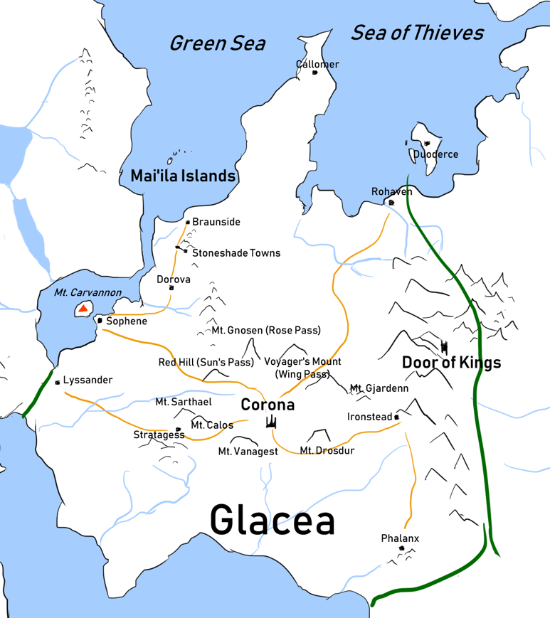Glacea itself is an interesting region, its main centrepiece being Corona (which we named way before Covid, so it’d be an unfortunate name now, lol), a city surrounded by 10 peaks. Glacea is an independent region stuck in a war of sorts with the bordering Imperium, separated by the Black Mountains, a war Kokona would have been caught in had the story expanded further.